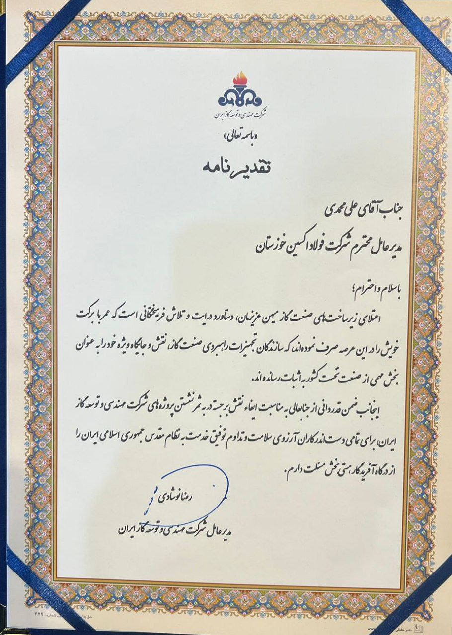 این تقدیرنامه به پاس تلاشهای شرکت فولاد اکسین خوزستان در اعتلای زیرساختهای صنعت گاز کشور و به ثمر نشستن پروژههای شرکت مهندسی و توسعه گاز ایران با همکاری شرکت فولاد اکسین خوزستان به مدیرعامل این شرکت اهدا شد.