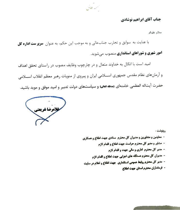 به گزارش نخبگان با صدورحکمی از سوی غلامرضا شریعتی استاندار خوزستان، ابراهیم نوشادی به عنوان سرپرست اداره کل امورشهری و شوراهای استانداری خوزستان منصوب شد.
