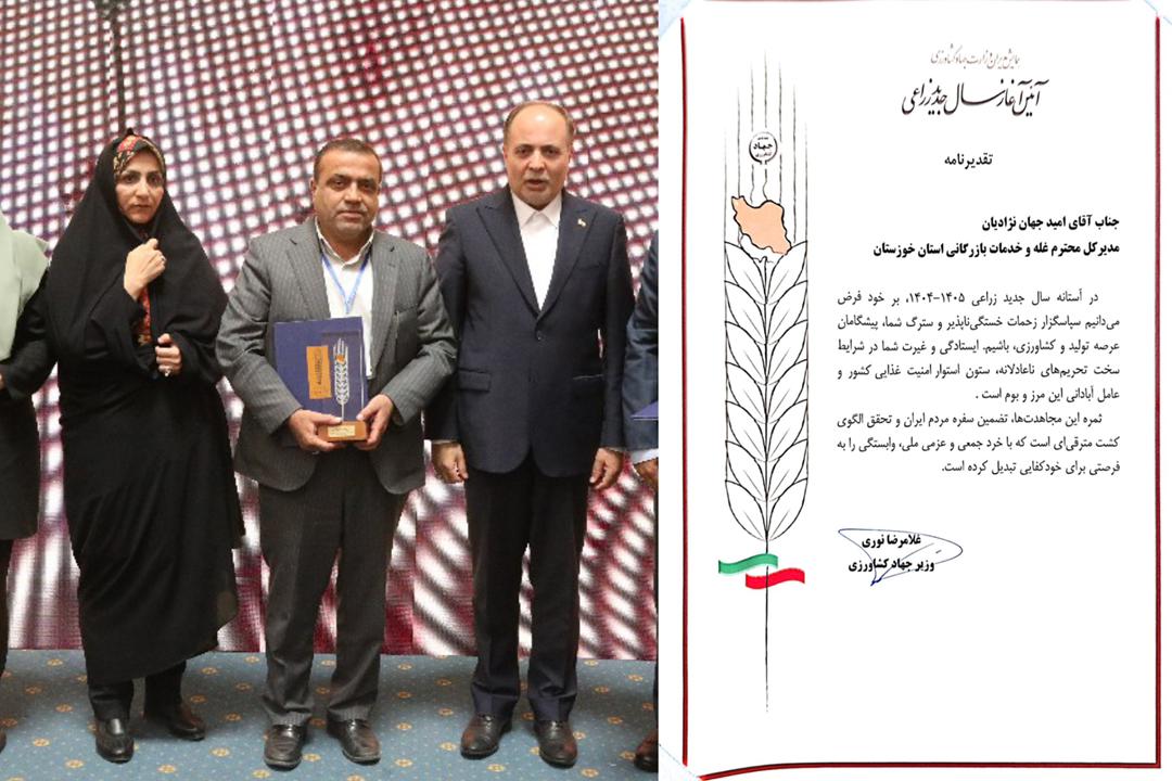 در ارزیابی سال زراعی ۱۴۰۴ ـ ۱۴۰۵، امید جهاننژادیان، مدیرکل غله و خدمات بازرگانی خوزستان، به عنوان مدیرکل نمونه کشور معرفی و مورد تقدیر قرار گرفت.